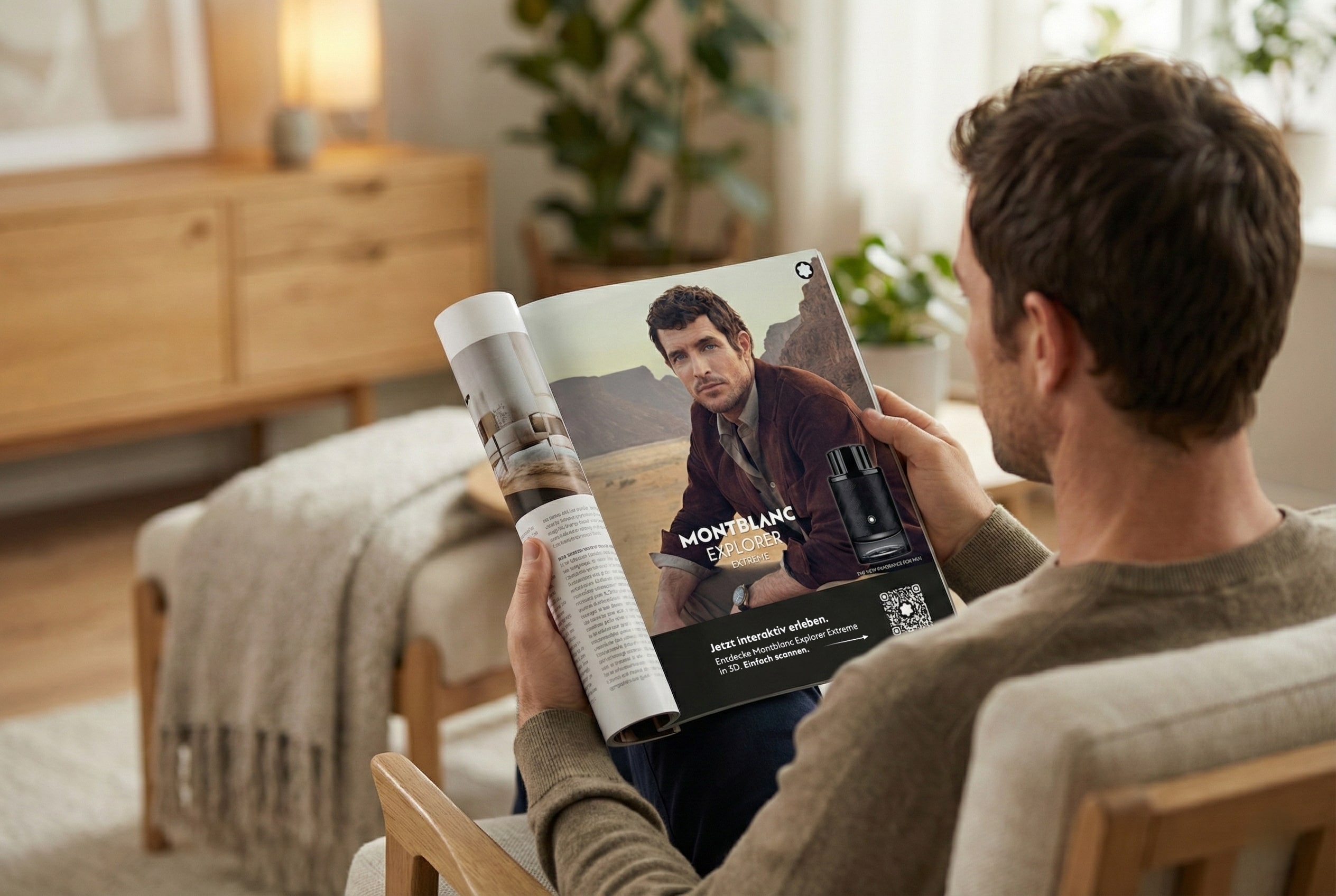 A captivating video that appears directly on the magazine page, immersing readers in the adventurous spirit of Explorer Extreme and the refined world of Mont Blanc fragrances.